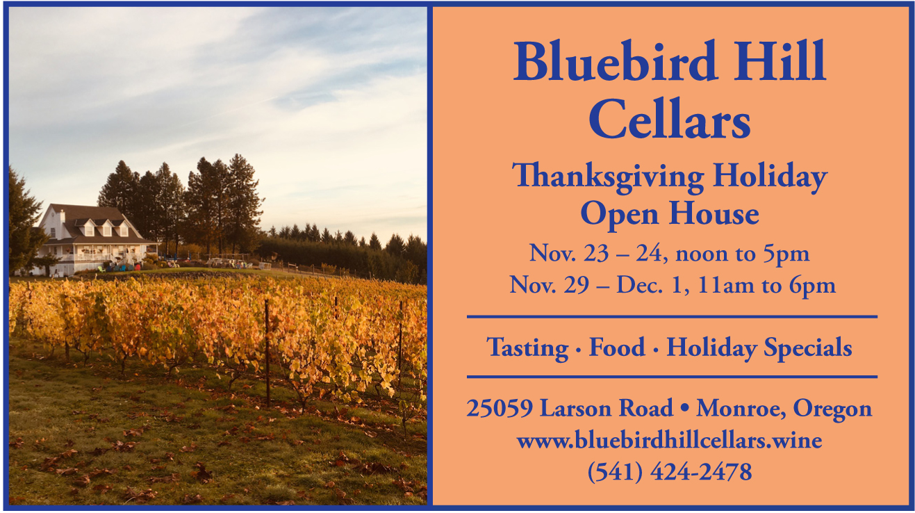 We hope to see you during our Pre and Post Thanksgiving Open houses. Also keep in mind that the tasting room open noon to 5 on Saturdays and Sundays during the month of December. We expect things to be relatively quiet and we will provide guests a relaxed, unhurried wine tasting experience. Need a gift idea for the Holidays? We are offering made to order gift baskets with your favorite Bluebird Hill wines and/or gift cards available in any amount and rechargable, they can be purchased at the winery or ordered by phone at (541) 424-2478. After December, as always, we are open by appointment and will be able to host your group, from two to eighteen people, with a bit of advance notice.