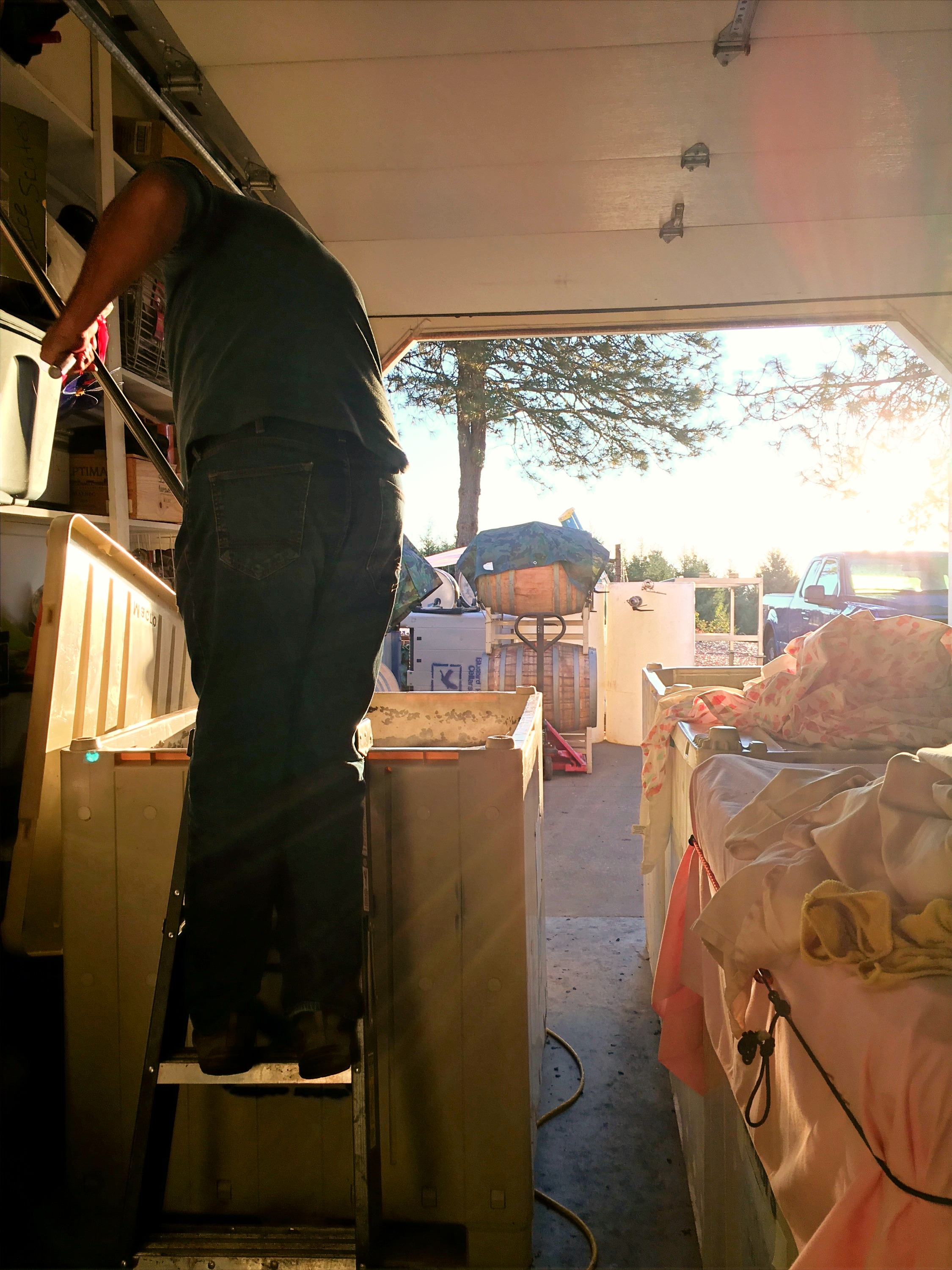 So now at this point, early October, we have multiple fermenters going, and performing morning and evening punch downs, at first daylight and early evening. This, we find, is one of the intense times of the whole year, requiring physical effort and long hours. We will say, a bit of a smile on our face, that many of those mornings, we took great delight in doing that early morning punchdown, pre-dawn, and opening the large overhead doors while we worked, to allow us a view to the east, as the morning sky moved from black, to pink, to other incredible morning sunrise colors. We have a few shots, as well, of the bins spewing a bit of fog, as the heated moist air from the fermenting bins would hit the cold air of the morning air! We have a few of these pics now posted to the website gallery.
