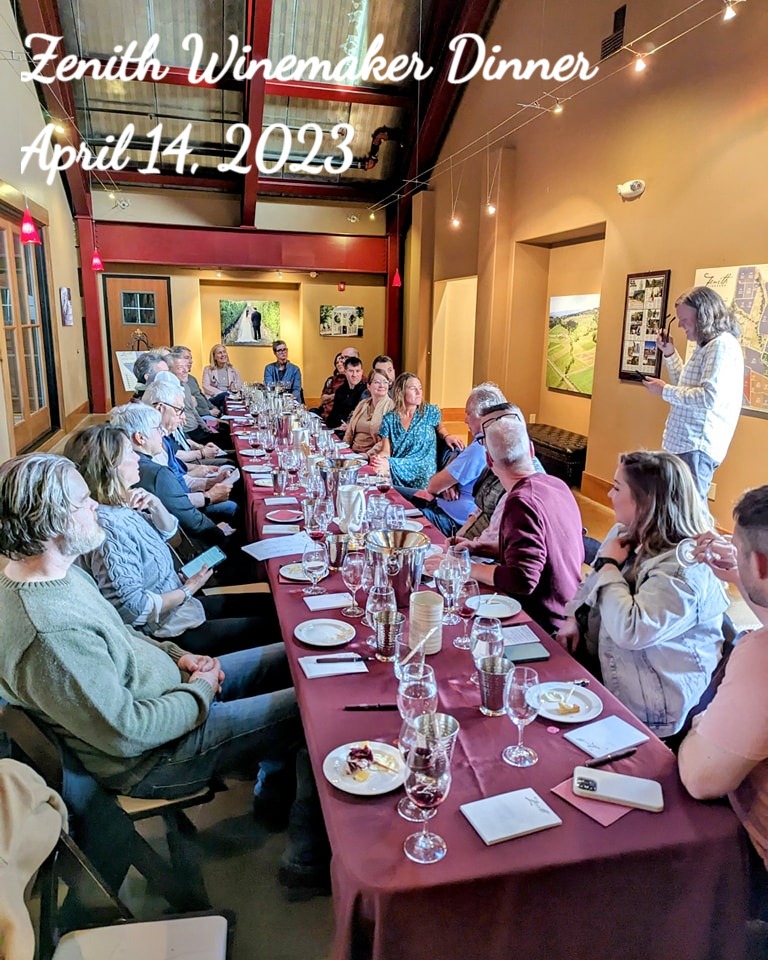 And speaking of the 2022 wines, weekend before last, Sue and Neil drove up to Zenith Vineyard in the Eola Hills, for their annual winemakers’ dinner hosted by Tim and Kari Ramey, owners of Zenith. This is an interesting event, it’s a combination ‘customer appreciation’ dinner for Zenith, and a technical tasting event. Zenith grape customers are all invited (there are about thirty different customers!) to bring their young 2022 wines, out of the barrel, and bring samples to taste, we go around the table and compare production notes. Bluebird Hill brought their 2022 Zenith Pinot Noir and the Zenith Chardonnay.