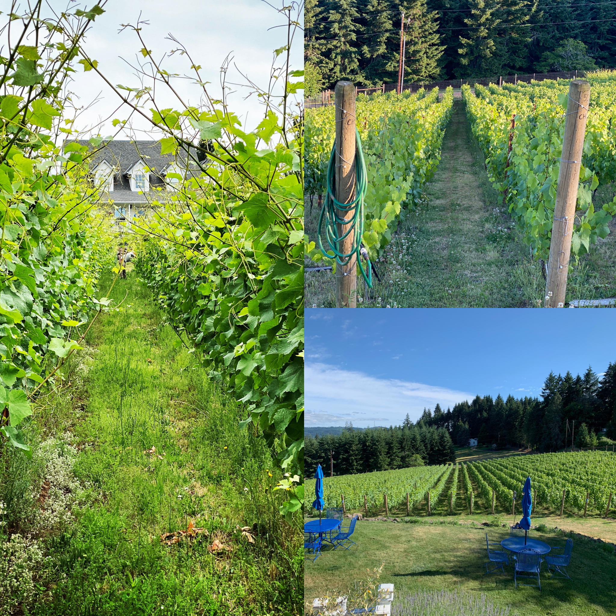 In the Winery: With Phase II of reopening in Benton County beginning in late May, we went ahead and opened our outdoor tasting area over Memorial Day Weekend, with some major changes in the way we operate, to ensure that social distancing and a secure environment is maintained. Our tasting room hours are still the same, Friday through Sunday, but we are asking guests to book online, email us at info@bluebirdhillcellars.wine or call (541) 424-2478 ahead to make a reservation for one of our socially-distanced tables. We have two large tables under cover on the patio, two tables of four with umbrellas out on the front lawn, and two bistro tables with umbrellas that seat 2-4 people out in our garden patio just outside the tasting room. All of these tables are 10-15 feet apart, and when we only have a few parties tasting, you might be 50-100 feet away from the next group. Secondly, you will find when you arrive, that the reception table is 10 feet away from your Bluebird Hill host, who will be behind the tasting room counter. Third, we have a new system for tastings: we are offering tastings of 4, 6, or all 9 wines, and we serve guests all the wines at once, in mini carafes on a plastic tray. This allows us to approach your table one time, instead of many times to pour each wine one by one, as we have done in the past. Interestingly, the response to this change has been outstanding – just about everyone has liked getting all the wines at once, allowing guest to taste at their pace, and trade tastes if they want (“I’ll give you my whites for your reds”)