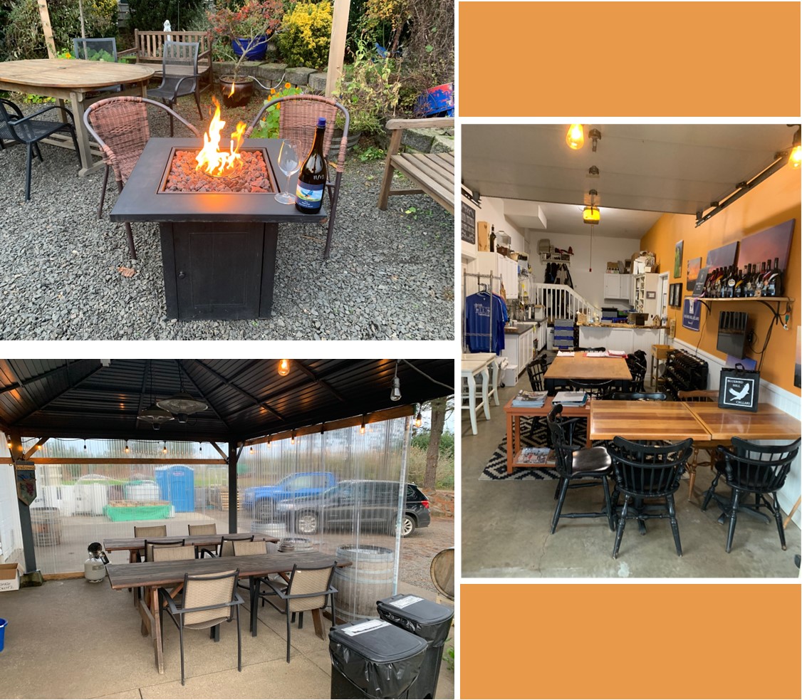 For those of you who had visited during the late fall or winter months, pre-quarantine, you know that we had a set of café tables and could seat four or five different parties all at one time in our cozy little tasting room. In adapting to the quarantine, we now find ourselves with more covered and weather protected seating then we have ever had, and all of it follows safe practices and appropriate social distancing! Inside the tasting room, we now have two tables with seating for up to twelve. Adjacent to the tasting room, under our metal canopy in the reception area, we have two picnic tables and can comfortably seat another eight or ten people out there. There are plastic greenhouse panels on two sides of the canopy, protecting the tables from the wind, and one open side facing out to the south and our nice view of the ‘Monroe Hills’ valley. And continuing what we’ve been doing for the past two summers, we have bistro tables and chairs, with propane heaters up on our front porch, with dry, protected seating for another twelve to sixteen people. Finally, on rain-free days this fall, we have our regular seating outdoors in the patio area and under our redwood pergola, with two wood burning firepits and a propane-fired firepit.