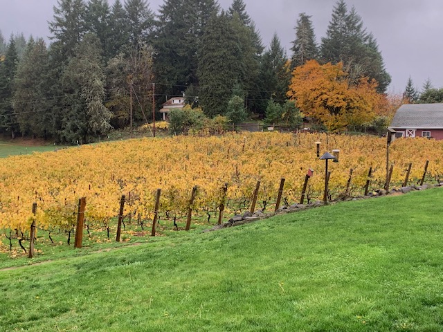 We’re very grateful, indeed, to have the always exciting, and sometimes frantic harvest and crush season behind us. We’re now looking forward to getting back to the more routine tasks that we take care of during the late fall and winter seasons: nursing the new wines through malolactic fermentation, the bottling of new release wines, and sending off sample bottles to various wine competitions and judgings. The vineyard looks great, we still have nice golden leaves on the vines, as we still have not yet had any serious frost on the property that would have finished off the leaves for the season. The first of the week, Josh and Tommy were out on a pleasant afternoon doing some mowing, mainly to mulch up the leaves that have dropped from the vines, along with the fallen leaves from our fruit trees around the yard.