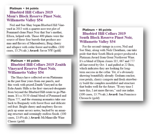 Platinum Awards: Sometimes this wine competition is described as the ‘Super Bowl’ of PNW wine competitions, as the only entries allowed are wines that have been awarded a gold medal in one or more competitions over the past 12 months. The competition, organized by Great Northwest Wine, awards platinum medals to those deemed worthy after tasting, judging, and voting by three panels of wine experts. In the 2023 competition, three Bluebird Hill wines hit for platinum: Our three current reserve Pinot Noirs, the 2019 Mom’s; South Block; and Zenith Vineyard. The Mom’s and South Block are 100% estate wine, and the Zenith is made at our winery, from fruit we purchase from Zenith, a very highly regarded vineyard in the Amity-Eola Hills AVA. See the reviews right here: