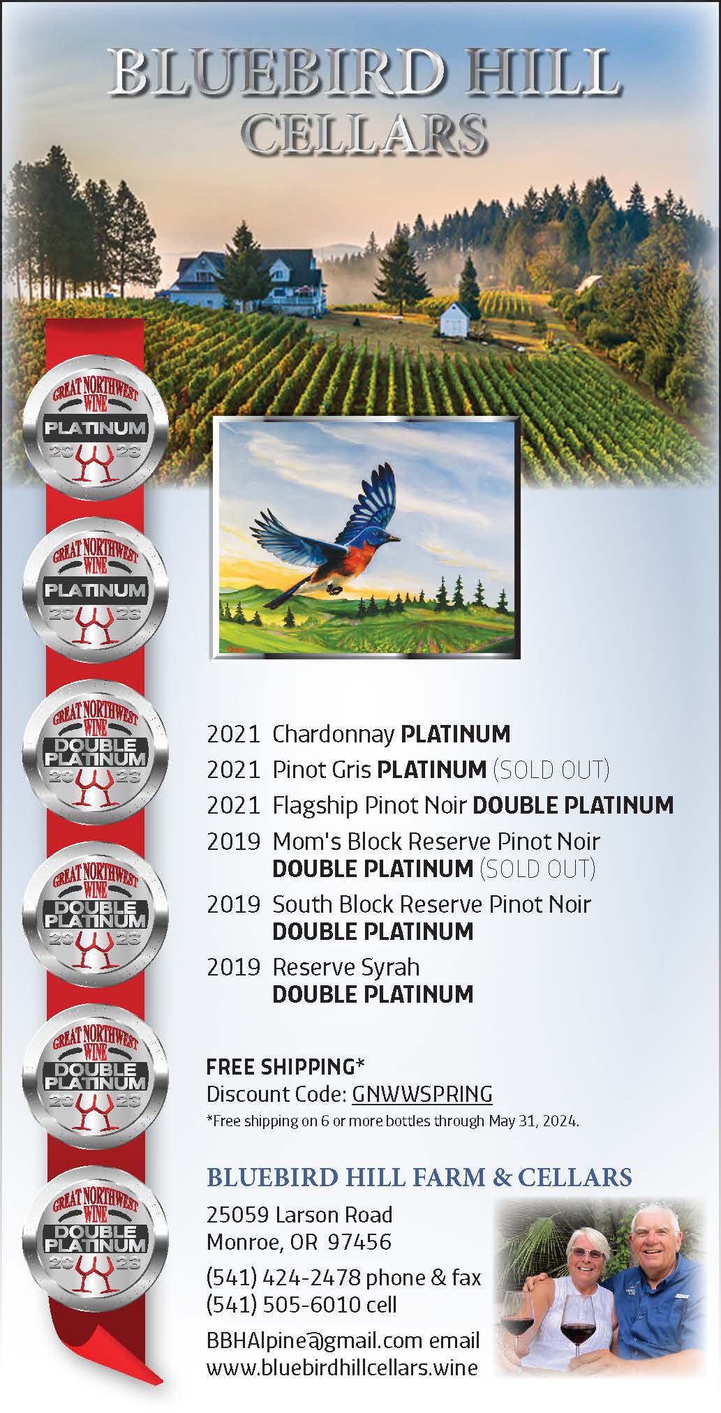 Maybe the biggest news, the most exciting to us, is the recent news that Bluebird Hill Cellars was named ‘Oregon Winery to Watch, 2024’ by Great Northwest Wines. GNWW has been around for decades, and focuses largely on wines produced in Oregon, Washington, and Idaho, they also convene the annual GNWW Platinum Competition, in which gold medal-winning wines may enter and compete for Platinum and Double Platinum medals. In part, based on our showing in this judging over the past five years (9 Platinums in 5 years), GNWW selected us as their Oregon Winery to Watch this year. It’s a big honor and humbling to now be a part of a set of only about 25 wineries, only one winery in the state is given this honor each year, some of the past winners include the likes of Reustle and Zerba. Keep an eye out for the date, we are planning a celebration at the winery in June…